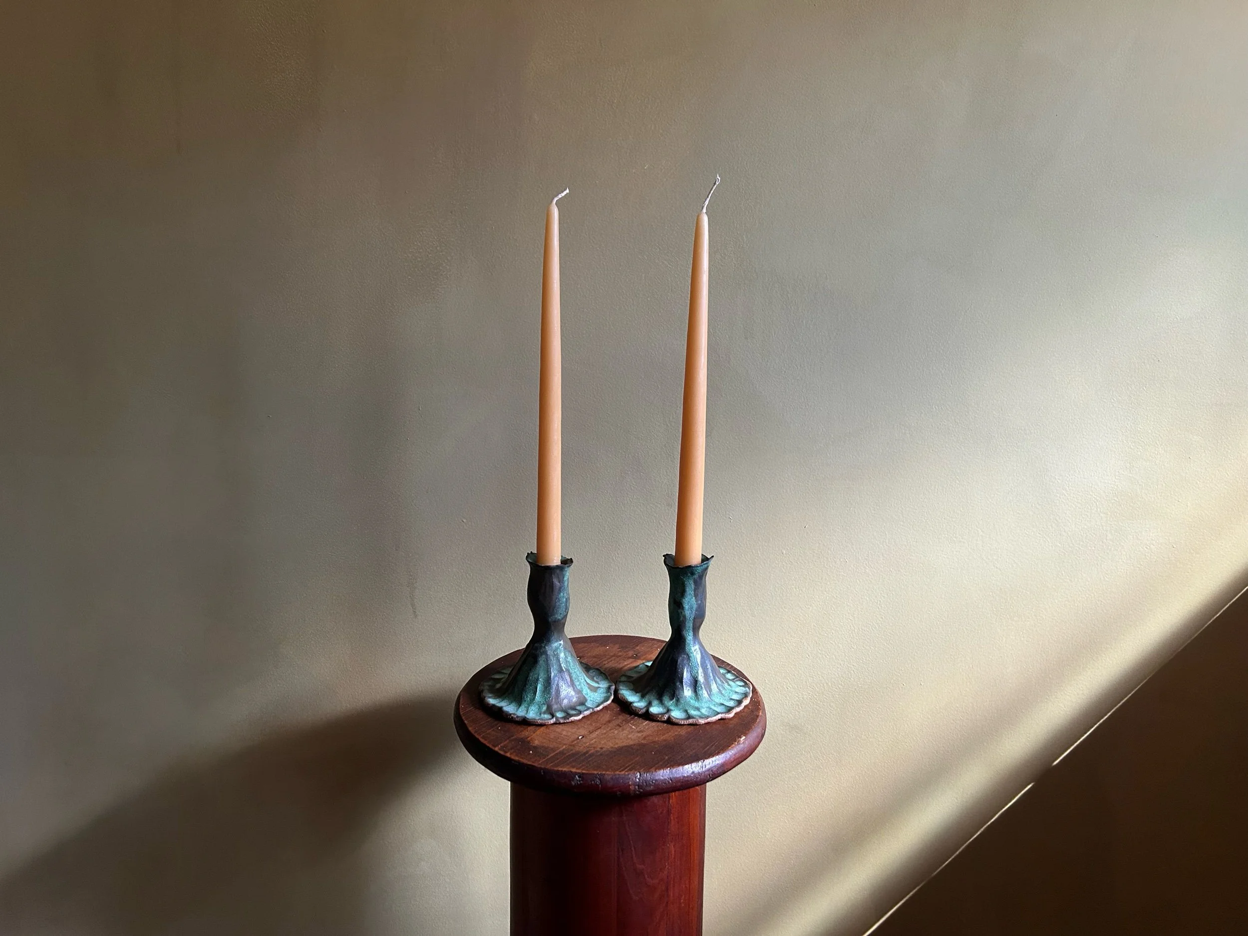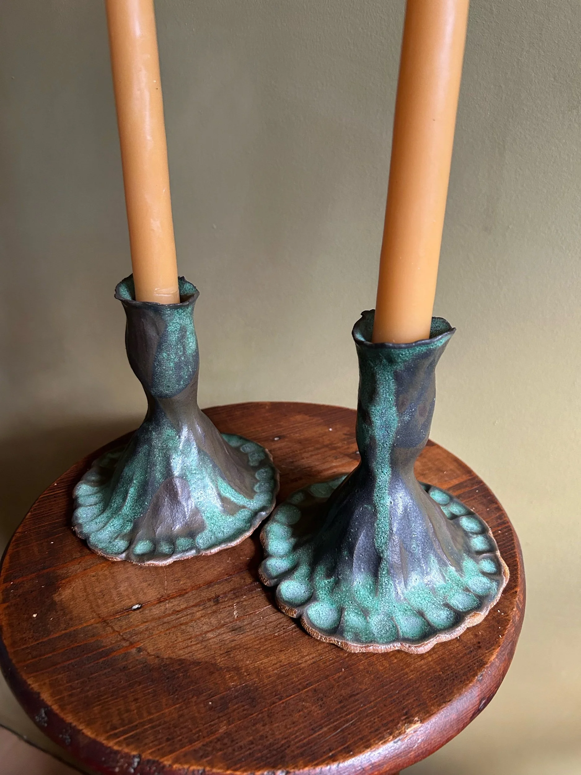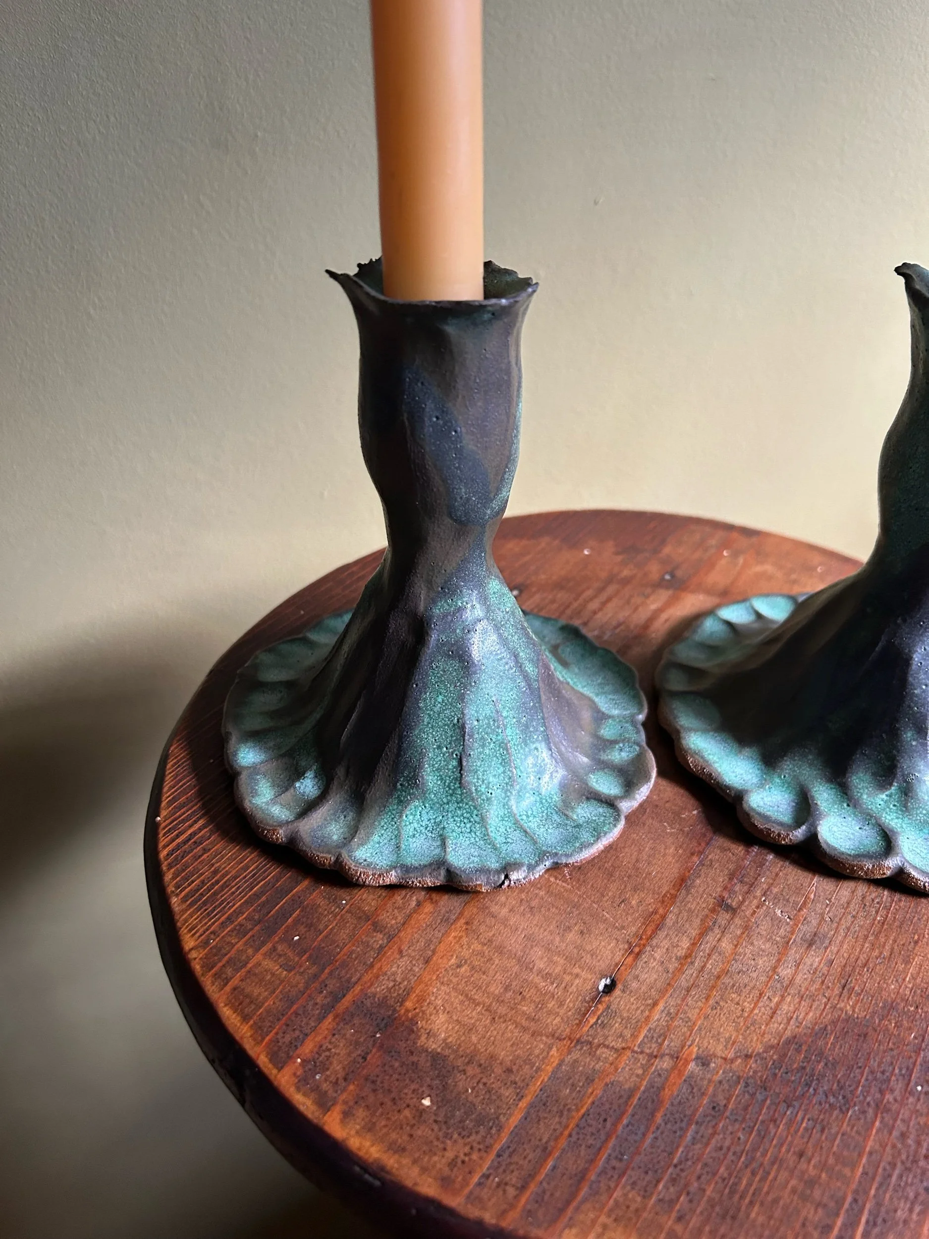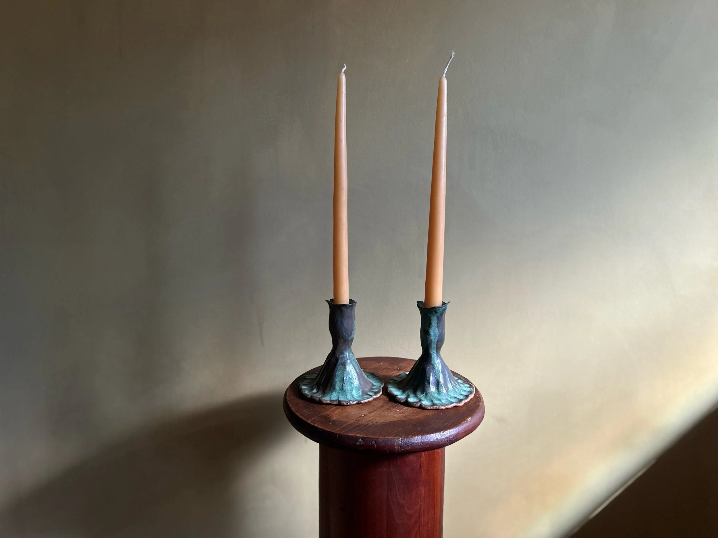 Handbuilt in red stoneware, this Copper Patina candlestick holder set brings the drama to your table. Beautiful variations in the glaze emphasize the organic textures and bell shape.
